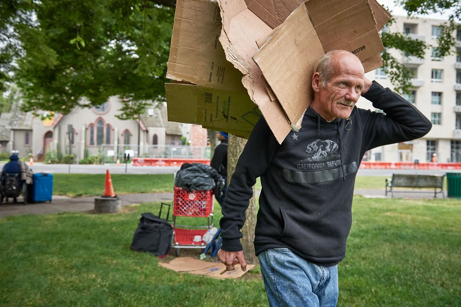 A gentleman moves the location of his cardboard bed. Silicon Valley, California.